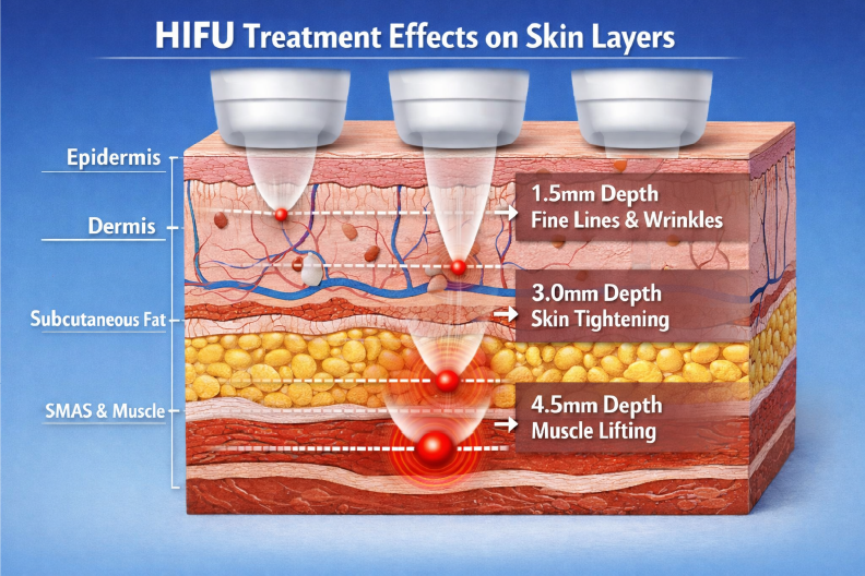 ▪️ HIFU is a non-surgical treatment that delivers focused ultrasound energy into deeper skin layers (typically 1.5–4.5 mm), targeting connective tissue and muscle structures without affecting the surface. This includes the Superficial Muscular Aponeurotic System (SMAS) – the same layer tightened during surgical facelifts. This depth is critical because it stimulates collagen and elastin production – proteins that decline with age and contribute to skin laxity and wrinkles.